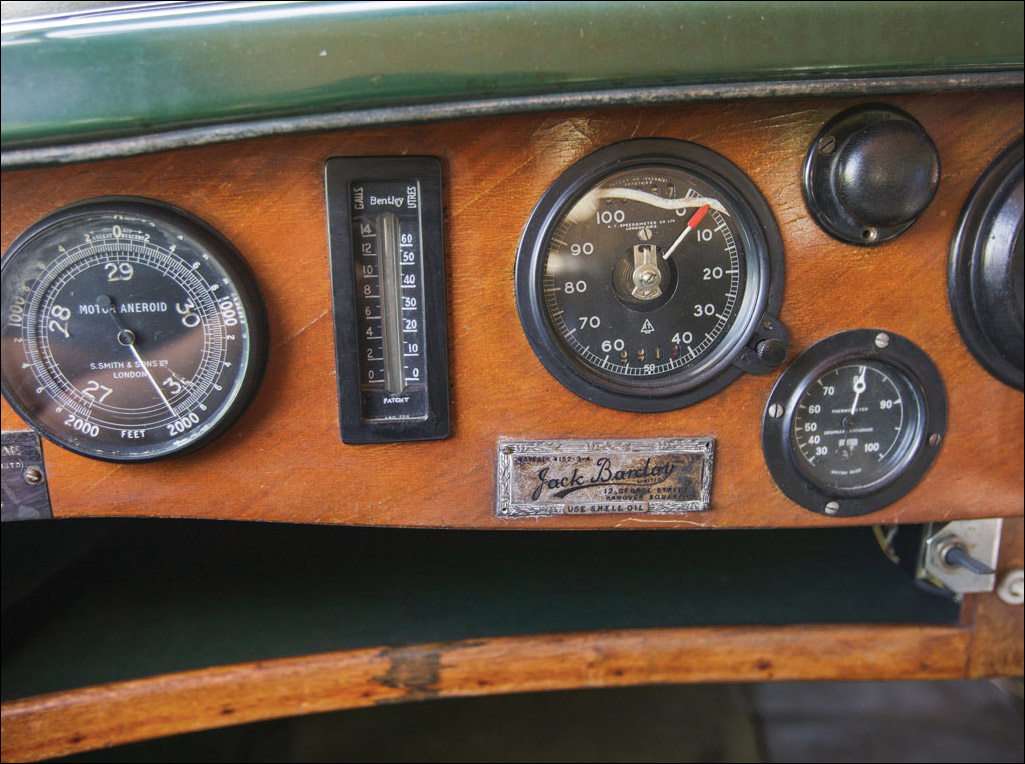 According to surviving Bentley chassis records, the car was regularly maintained through 1938, with a new 4.16:1 rear axle installed in September 1933. It was apparently not registered during the war years but continued in Mr. Phillips’s use; he is known to have loaned it to his squadron leader, Peter Balean, of Derby, at least once while Mr. Balean was on leave in 1941. Squadron Leader Peter Balean was impressed enough by the automobile that it remained vivid in his memory for another 19 years, during which time he kept up contact with Mr. Phillips and the car. In June 1960, he was able to become the Bentley’s second owner, acquiring it from Mr. Phillips’s estate, where it had been regularly maintained by a chauffeur. It would remain in his care until 1989. It is fascinating that, in its first 58 years, this car had two owners who knew one another and were passionate enthusiasts and aviators in the service of their country. (Note the rare accessory altimeter, ideal for a pilot’s automobile!)