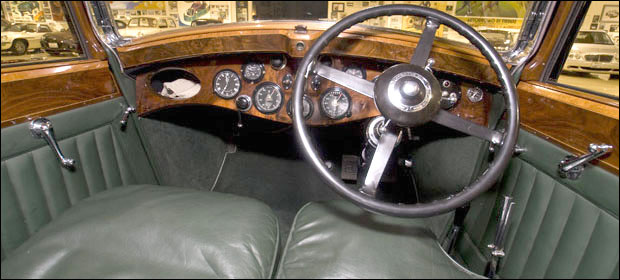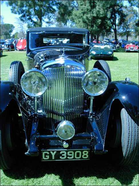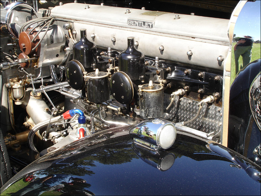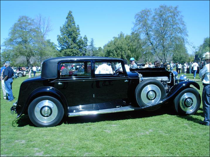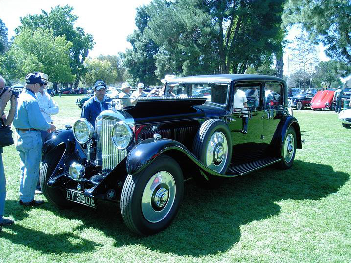 "W. O. Bentley described his 6 cylinder cars as having rather a locomotive look about them, and this one certainly does! Sold new in 1932, with a 5-year guarantee, the chassis has 13' wheelbase, and the engine displaces 7983cc with four valves per cylinder. The sump holds 5 imperial gallons (24 U.S. quarts of oil). The coachwork is typical of H.J. Mulliner's best work of the era, with an extremely well-balanced four door saloon body with deliciously curved wings, and it is painted black. The luxurious upholstery is down-filled. The owner drove it round the track at Laguna Seca as well as in the Teamkhana -- just two days before judging. Congratulations are in order for so beautiful and complete a restoration on this gigantic. 'Best Pre-War' car."